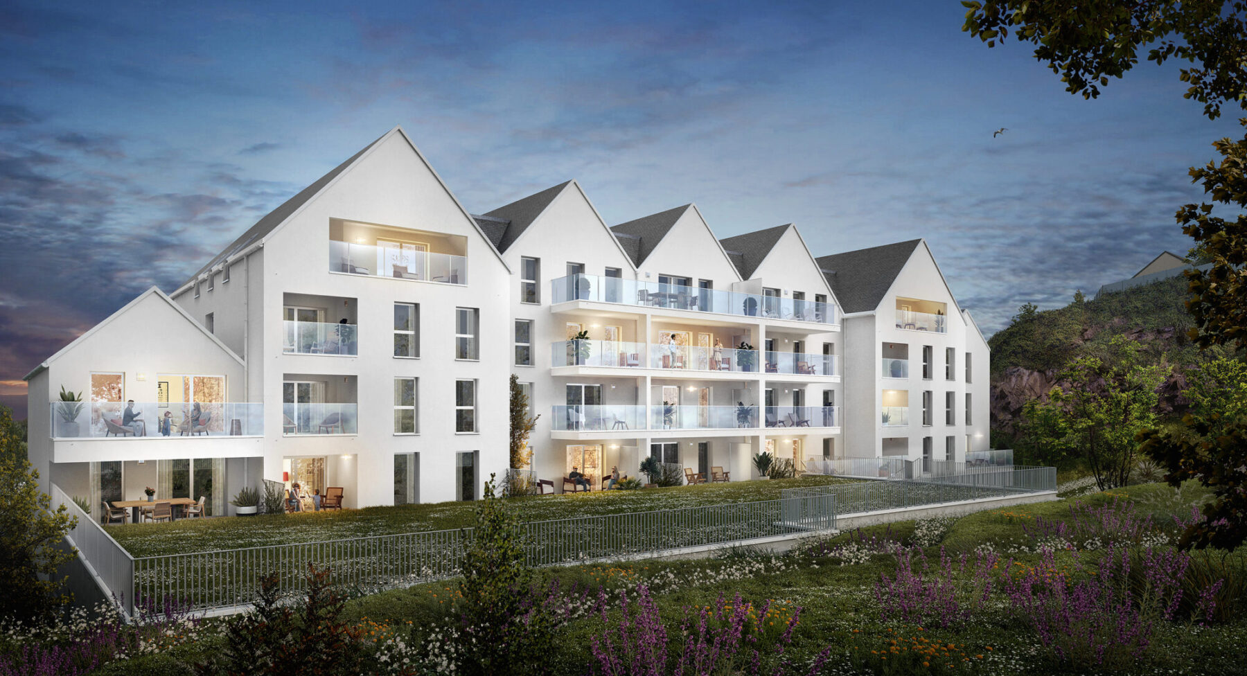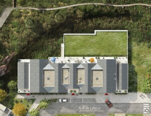À l’Est, des espaces plantés en pleine terre accueillent des végétaux grimpants qui habillent les façades au fil des saisons. À l’Ouest, le bâtiment s’inscrit naturellement dans le relief existant, au pied du coteau issu de l’ancienne carrière. Des plantations variées offrent aux habitants un écrin de verdure apaisant et respectueux de l’intimité de chacun.